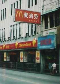 2010年06月07日(月)商売繁盛 (1997年当時) 世界中どこでもマクドナルドはあるようだ。廈門の街で見かけたマックはなか なかユニークな事をやってくれる。ライバル店の上に「ここから歩いて3分です 。マックに来てください」なる内容の看板を堂々と付けていたのだ。営業妨害に はならないのだろうかとその店に同情しながらも、そのライバル店から3分歩い てマックに入ったのは、言うまでもない。広告の力恐るべし!値段はバリューセッ トでだいたい日本円で300〜400円ぐらい。店内はお客さんでいっぱいなの は日本と変わらない。ここでもメニューにスマイル0元と書いてあったかどうか は謎のままである。 |