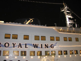 2004/01/18友人や妻とクルージングディナーに行ってきました。場所はヨコハマです。 小雪降る中、ベイブリッジの下をくぐり抜けて2時間程度回ってくるコースです。 コースといえば、料理。中華料理の食べ放題バイキングでした。エビやお肉や 野菜等、一品一品がとても美味しく、みんなと楽しい時間を過ごせました。 船内のじゃんけんイベント(3回連続で添乗員さんに勝つとワインフルボトル贈呈)で 友人が見事(!?)完勝。→添乗員さんはとても優しかったということです(笑)。 |