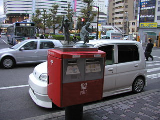 2004/09/21学会発表のため、徳島にやってきました。JR徳島駅前の郵便ポストです。 上に、阿波踊りの像が飾ってあるのが良いですね。 |