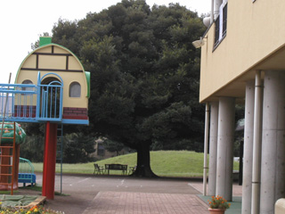 2004/09/25広い庭の幼稚園があるというのでお散歩してきました。大きな木が一本あり、 あとは芝になっていて遊びやすさ満点といった感じでした。 |
