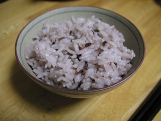 2004/10/10古代米といわれる黒米を白米に混ぜて炊いてみました。お赤飯みたいに 色が付くようです。味はたいして変わりませんでしたが、なんかめでたい感じです。 |