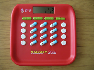 2004/11/13ウィルスバスーター2005のβテストに参加していたら、 プレゼントが送られてきました。数字の部分がお薬カプセルになっている特製電卓です。 |