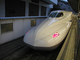 2008年03月18(火)新幹線 N700系 最新鋭の新幹線です。東京から小倉まで、約4時間ちょっとで結んでしまいます。 車体の揺れも少なくて乗り心地最高。はーやいぞ、はーやいぞ、ま〜どの外〜、 といった感じです。 |