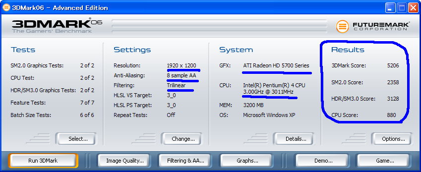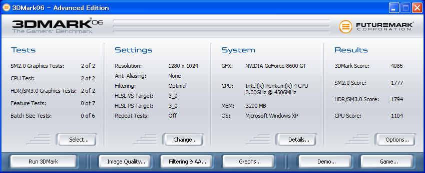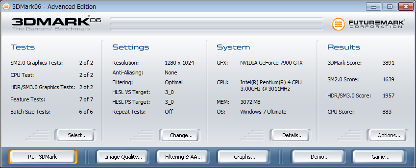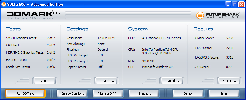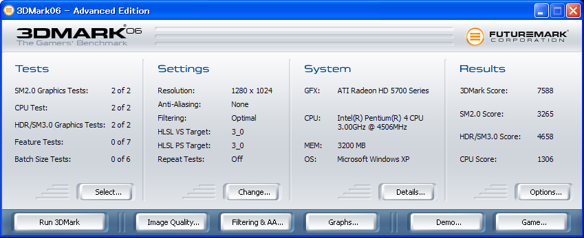 2010年11月08日(月)![]() やはりCPUがかなり旧世代のために大幅に足を引っ張っています。Pentium4 はそろそろ眠らせてあげて、 Core i7 950あたりを導入したいです。 2010年09月23日(木)現在主力機のきつね君1号に今まで現役で活躍してきたハイエンド(当時)グラフィックスカード nVIDIA GeForce 7900GTXから、いま人気のAMD ATI Radeon HD5770に換装してみました。 グラフィックカードの世代的には、4世代程度前のものから現在最新鋭に追いついたことになります。 2010年07月10日(土)現在主力機のきつね君1号に3DMarkがちゃんと完走するように、デフォルトのCPUクロック3.0GHzと オーバークロックしていたグラフィクスカードを定格に戻してみました。 2010年07月09日(金)現在主力機のきつね君1号にCPU Pentium4 631 4.5GHz オーバークロック、 GeForce 8600GT オーバークロックを 乗っけてみてみました。それでも、前のGeForce 7900GTXに敵わないとは...。 2010年04月11日(日)古いパソコンではやはり、Windows7 RC版と Windows XP版とでは、後者に軍配が上がりました。 このテストの場合は、ちゃんとハイパースレッディングの効果が効いて有無によって有りの方が 若干性能は良いようですね。 2010年04月01日(木)メジャーバージョンアップして1.20になったのを機に本格導入を致しました。 私のパソコンのOSはWindows XPなのでDirectX 9.0cまでしか対応していないです。 |